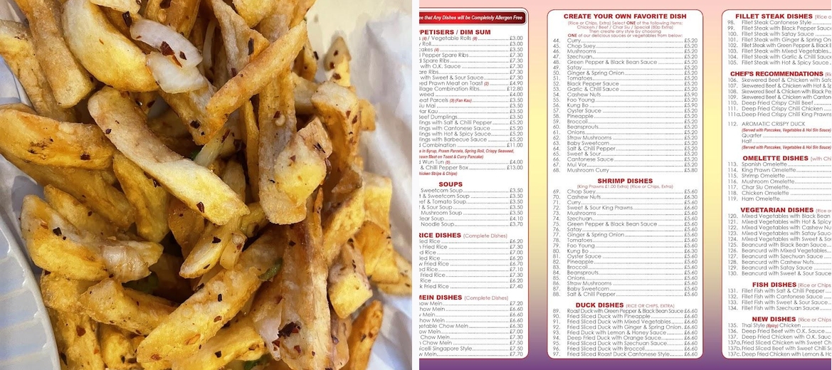 Welcome to Treasure Village, your go-to destination for delicious Chinese cuisine in Ashton-in-Makerfield. Offering a delightful mix of takeaway, delivery, and dine-in options, our menu features favorites like salt and pepper chicken and savory chow mein, all priced affordably at £1–10. Enjoy a casual dining atmosphere with quick bites perfect for lunch or late-night cravings. Our wheelchair-accessible facility ensures everyone can indulge in the flavors we offer. Friendly staff, free street parking, and a 5-star hygiene rating make every visit a pleasure. Join us today at 152 Old Rd and savor the taste of Treasure Village!Patrons rave about the salt and pepper chicken, often highlighting its perfect seasoning and flavor. The chow mein consistently earns top spots in customer favorites, praised for its freshness and depth of taste. Many enjoy the excellent chips and curry sauce, noted as some of the best in the area. Regular customers appreciate the generous portions and the ability to customize dishes according to their tastes. The casual and friendly atmosphere also stands out, as many reviews mention the welcoming nature of the staff, enhancing the overall dining experience.